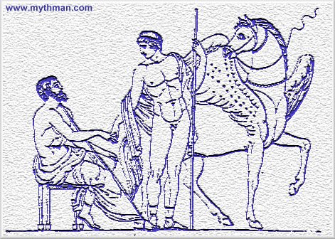 All Bellerophon had to do was slay the beast. "Oh, by the way," said the king, "thus far everybody else who tried to kill the Chimaera has been devoured by the monster." Good luck, and good riddance, thought king Iobates, certain that he was sending the young man to his doom. Before setting out on this impossible task, Bellerophon was astute enough to consult the seer Polyeidus, who advised him to catch and tame the winged horse Pegasus. The young hero spotted this marvelous horse as it drank at the well of Peirene, on the Acropolis of Corinth. Some say that the great goddess Athena provided a magic golden bridle that Bellerophon slipped over Pegasus, instantly taming him, while others maintain that Athena delivered Pegasus already bridled, while yet others claim that the flying horse was presented by Poseidon, who they say was Bellerophon's real father. Can we get a consensus here, folks? Just asking...