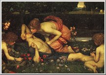 APHRODITE Aphrodite each year would return to Paphos, in Cyprus, and swim in the sea for good luck and to rejuvenate herself. Robert Graves, in his book "Greek Gods and Heroes", tells us that "Aphrodite's throne was silver, inlaid with beryls and aquamarines, the back shaped like a scallop shell, the seat made of swan's down, and under her feet lay a golden mat -- an embroidery of golden bees, apples, and sparrows." The poets liked to paint an idealistic picture of Aphrodite, filled with beauty and happiness - The winds flee before her and the storm clouds; sweet flowers embroider the earth; the waves of the sea laugh; she moves in radiant light. Without her there is no joy nor loveliness anywhere. However, in the Iliad, the story of the Trojan War which praised brutal strength and power as heroism, she was shown as a soft and weak creature, whom even mortals could attack, and even wound in battle. Aphrodite wasn't always sweet. When it suited her, she could be rather malicious and treacherous, and her influence over men was often deadly. She could turn the heart of any man to longing and passion, and it was said that when she spoke, even Zeus listened...after all, the King of the Olympians was notorious for succumbing to Love's temptations. The lame god of the forge and metalworking, Hephaestus, was her husband, although he was the only god to be physically ugly. It was an arranged marriage - Some say that when Aphrodite first arrived on Mount Olympus, Zeus was struck by her beauty and radiance and he was certain that the other gods would fight for her affections. So he awarded Aphrodite to the most dependable and steady deity, Hephaestus. Needless to say, Hephaestus considered himself the luckiest god on Olympus and he did his utmost to please his gorgeous bride, continuously creating and designing new golden jewelry and furniture to please her. In addition to her irresistible looks Aphrodite had a magical golden girdle, made by Hephaestus, that when worn compelled anyone she wished to desire her. As if she weren't irresistible enough already! But Aphrodite considered it shameful and a disgrace to be the wife of such a "blue collar", manual-labor kind of god. Hephaestus was unattractive, sooty-faced, hard-working, crippled and not quite the "party animal" that his wife was, and she insisted on having a bedroom of her own, separate from his. The Three Fates assigned to Aphrodite one divine duty only - to make love. Tough work, but someone's got to do it! According to the writer Hesiod, however, one day Athena caught Aphrodite secretly at work on a loom, weaving some colorful cloth. Athena complained that Aphrodite had infringed on her own duties and threatened to abandon them altogether. Aphrodite proceeded to apologize profusely to Athena and has never done any work since. Opposite Aphrodite high on Mount Olympus sat the god of War, Ares, and the two had an ongoing notorious love affair that scandalized all of Olympus. Ares and Aphrodite were always holding hands and giggling in the corners of the palace, which made her husband Hephaestus very jealous. One night the two lovers stayed a little longer in bed and when Helios, the Sun God rose and saw them, he proceeded to tell Hephaestus. The jealous husband then fashioned an invisible bronze hunting net and captured the two lovebirds, but when he assembled the Olympians to render judgment, they wanted nothing to do with punishing them. Zeus even told Hephaestus that he was stupid to make such a golden girdle for his wife, and that he shouldn't be surprised that men could not resist her. Aphrodite had three children by Ares - Phobus, Deimus and Harmonia. She pretended these were her husband's and presented them as such to Hephaestus. Aphrodite wasn't very faithful to her husband, to say the least. Some of her other lovers included Dionysus, god of wine, the messenger god Hermes, and the King of the Sea, Poseidon. Two of her more famous mortal lovers were Adonis and Anchises (see below). Aphrodite "thanked" Hermes for not taking her husband's side when she was caught with Ares by spending the night with him. The result was Hermaphroditus, a double-sexed being. Equally grateful to Poseidon for siding with her, Aphrodite bore him two sons, Rhodus and Herophilus. But Hephaestus was so in love with his wife that he chose to overlook her numerous indiscretions. She was the goddess of Love, after all! Aphrodite's union with Dionysus produced Priapus, a horribly ugly child with enormous genitals. This revolting and obscene appearance was a punishment from Hera, wife to Zeus, who disapproved of Aphrodite's promiscuous ways.