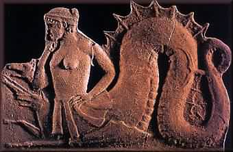 CIRCE Circe is the witch living in the island of Aeaea, who was visited by the crew of heroes called the Argonauts and the Trojan War hero Odysseus. Circe was a powerful witch who, with the help of herbs, muttering incantations, or praying to her gods, could turn men into animals or create unsubstantial images of beasts. She was able to darken the heavens by hiding the moon or the sun behind clouds, and destroy her enemies with poisonous juices, calling to her aid Nyx (Night), Chaos or Hecate, goddess of the crossroads. In her presence and because of her enchantments the woods could move, the ground rumble and the trees around her turn white. But as witchcraft may make a victim also of him or her who practices it, the nights of Circe could be wasted in fear because of the uncontrolled visions which filled her house. And so, for example, the walls and chambers of her palace could seem to be bathing in blood, while fire could seem to devour her magic herbs. That is why it was a relief for her when daylight came and she could bathe and clean her garments forgetting the scaring nightly visions. If these were visions, those who came to her abode could hallucinate as much as she did, and if not, her world was in fact transformed. For Circe is said to have been surrounded by all kinds of beasts which cannot be seen elsewhere, having an appearance which reminds of what earth produced out of primeval slime. And yet, when others came to the palace of Circe, they also saw many beasts, but of the regular kind, that is, such as lions, bears and wolves, which however, acted as domesticated animals showing their kindness by wagging their tails. Some say these were actually the drugged victims of Circe. The witch Circe, whose hair resembled flames, lived in Aeaea, an island which could be located off the western or eastern coast of Italy, where she was brought by her father Helius. The name of this elusive island is what some call a palindrome, for it is the same when read backwards or forwards. Some of those who visited Aeaea have told that Circe, who lived in a house made of stone in the middle of a clearing in a forest dell, used to sit on a throne wearing a purple robe and a golden veil. They said that her attendants were Nereids and Nymphs, whose only task to sort out the plants and flowers of Circe's herbarium, and put them in separate baskets. Besides supervising them Circe, while singing beautifully, wove delicate and dazzling fabrics, which is one of the goddesses' favorite occupations. Others have said that Circe was attended by four maids, one who threw covers over the chairs, another who drew silver tables up to the chairs, placing golden baskets on them, another who mixed the wine, and a fourth who fetched water and lit up the fire to warm it. Circe fell in love with Glaucus, brother of the Nereids, who some say had once been a mortal fisherman but afterwards became a sea-deity by chewing a plant. However Glaucus loved Scylla, who was a most beautiful young woman, and when she went to bathe in the sea, Circe, out of jealousy, poisoned the water with her magic drugs. This is how the beautiful girl became a monster with the face and breast of a woman but having in her flanks six heads and twelve feet of dogs, and a danger for ships passing the strait of Messina between Sicily and Italy. It is in the neighbourhood of Circaeum, when the witch Circe was once gathering herbs, that she met Picus and instantly fell in love with him. This Picus, son of Cronos, was a demigod living on the Aventine hill. He also used powerful drugs and practiced clever incantations, being able to play many tricks. Circe loved him, but he, being in love with the singer Canens, daughter of Janus, refused her. Turning twice to the east and twice to the west while touching Picus thrice with her wand as she sang her charms, Circe turned him into a woodpecker. And after this she populated the surroundings with many beasts, for Picus' friends coming to her and asking for the young man, were all transformed by her into animals of many shapes, while Canens, in grief for Picus' absence, melted away in tears and vanished. The island of Circe was visited by the Argonauts, when they were escaping the Colchian fleet. Some say that Medea, who was with Jason and the Argonauts, wished to visit her aunt, but others have said that it was the ship "Argo" itself which instructed them to come to Circe and be purified for the assassination of Medea's brother Apsyrtus. Others say that Zeus himself was seized by wrath when he learned about the ruthless murder of Apsyrtus, and he ordered that the Argonauts should be cleansed by Circe. In any case Medea and the Argonauts could leave Aeaea purified by the witch. It was in great despair and exhaustion that Odysseus and his crew arrived to Aeaea, for they had barely escaped the Cyclops Polyphemus and the cannibals in the land of the Laestrygonians. After resting on the beach for three days Odysseus, who had seen a wisp of smoke in the distance, divided his men in two groups and sent Eurylochus with twenty two men to explore the terrain. When Eurylochus's party found Circe's house, the witch invited them to enter and all of them followed her except captain Eurylochus, for he, suspecting a trap, stayed outside. Those who came in Circe treated with a mixture of cheese, barley meal, and honey flavored with Pramnian wine, to which she added a powerful drug to make them forgetful of their native land. When they had eaten their meal she struck them with her wand, and driving them off, put them in the pig sties, for they now looked like swine and grunted exactly like pigs, though their minds were unchanged. When this happened Eurylochus hastened back to the beach and reported to Odysseus that his whole party had vanished. And when Odysseus decided to go to Circe's house there was no way to convince Eurylochus to make his way back to the house of the witch. So Odysseus went by himself and in his way to Cir