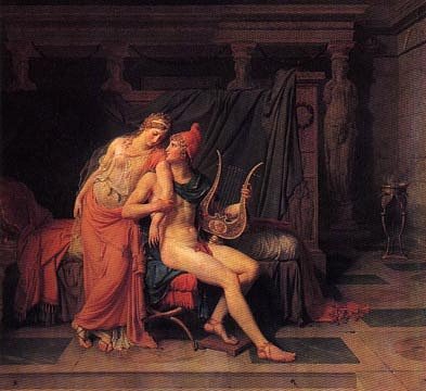 Paris did not try to disguise his adoration, much to the initial discomfort of Helen, who was certain that Menelaus would suspect that she encouraged his passion. For days she tried to ignore Paris' soulful glances, loud sighs and shameless signals. To no avail. She even found the words 'I Love You, Helen!' traced in wine on the table top. But Menelaus was a jovial and obtuse sort, who suspected nothing. Emphasis on the 'obtuse', I suppose...Seriously, if you're married to the most beautiful woman alive, wouldn't you be a little less trusting of other men's motives vis-à-vis your wife? Especially handsome strange princes from Troy who brought his wife glittering gifts of gold? Not Menelaus, the oaf...someone should have warned him to beware Trojans bearing gifts... Matter of fact, when a bit of business came up on the tenth day, cheerfully he sailed off to Crete, leaving Helen to entertain their Trojan guests. And entertain them she did...Cousin Aphro had seen to that. The very night of Menelaus' departure Helen boarded the flag-ship and eloped with her Trojan prince, leaving Menelaus a short "Dear Yanni" type letter: "Dearest Mene, I asked you to take me to Paris in the spring, and instead you sprung Paris on me. Sorry, hon, but the man's a stud! As much as I tried, I couldn't help falling in love with him. He's a god! I'll be gone when you return from Crete. Don't take it personally, Mene dear, but I've discovered that money can't buy happiness...a girl needs some passion once in a while, and you just don't do it for me, big guy. Sorry. No