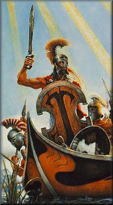 PARIS LEAVES FOR SPARTA The Trojan matchmakers all wanted a piece of Paris, for he was the only one of Priam's sons yet to marry, and damn was he ever handsome! But Paris would shoo them away, saying that he placed his trust in Aphrodite alone. He began plotting how to get to Sparta so that he could meet his destiny, the splendid and unrivaled Helen. Well, well, well....I'm here to tell you that it's a tangled web spun by the Fates, those old crones...Guess who shows up unexpectedly at Troy? None other than Menelaus, King of Sparta and husband of Paris' obscure object of desire. It seems that a terrible plague was ravaging Sparta and the Oracle of Delphi had uttered that heroic sacrifice must be offered at the tombs of a couple of Prometheus' sons, Lycus and Chimaerus. The tombs were near Troy, and Menelaus had stopped for directions. How unlike a man... Sly Paris wasted no time in befriending Menelaus, going so far as to ask that he be invited to Sparta, where he could be purified by King Menelaus for the accidental killing of young Antheus with a toy sword. (Yes, a toy sword...Don't ask...Someone should have told those ancient Greeks to make toy swords out of wood instead...Oh my...) Menelaus graciously agreed to Paris' request. Bad move. Bad, bad move. Following the advice of Aphro, at once Paris commissioned a fleet to be built for him, with its flag-ship sporting a figurehead of an Aphrodite holding a miniature Eros. Cute. Aeneas, son of Anchises and a cousin of Paris, accompanied him. As the ships were about to sail away, wild-haired Cassandra and her brother Helenus foretold the catastrophe that the voyage would cause, but do you think anyone would believe them? No. Even King Priam ignored his prophetic children. Paris' lover, Oenone, came to bid him a fond adieu, and tears streamed down his face when he kissed her goodbye. "Come back to me if ever you are wounded," she told him, "because I alone can heal you." Cool. Nice to have an ace in the hole. Assisted by a favoring breeze sent by my cousin Aphrodite, the fleet soon reached Sparta, where they were hospitably received by Menelaus and were feted and feasted for nine days. Let's just say the banquet was anything but, well, Spartan... Enter Helen. Amidst all the clamor, her appearance stilled the packed room. Those who beheld her for the first time instantly fell in love with her, and those who had seen her before, fell in love anew. The woman was stunning. The woman was truly stunning. Paris presented her with glittering gifts, which he had brought for her from Troy. She blushed as their eyes met. What a handsome stranger! she thought... sure wish my man Menelaus would lose the soldier garb and dress like this prince...wouldn't hurt if he took an occasional bath, too! Damn, but this Paris stud sure smells good! Nice work, Aphrodite.