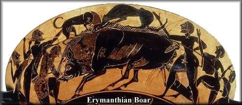 LABOR FOUR Eurystheus was determined that Herc's next labor would be his last. He wanted my nephew dead and out of the way, this wasn't fun any more. Dispatching his scouts throughout the land, he ordered them to seek a task so difficult that even the greatest hero who ever lived couldn't complete it. The scouts returned with sordid stories of a fierce and enormous beast which haunted the slopes of Mount Erymanthus. Uncle Homer once told me that the mountain was named after Erymanthus, a son of Apollo. This unfortunate soul one day chanced to walk by a spring and had observed my cousin Aphrodite bathing her fair body. Now, cousin Aphro is no prude, but instead of revealing himself, Erymanthus hid behind the cypress trees and peeped to his heart's content. Realizing that she was being watched, Aphrodite decided to teach the pervert a lesson - Emerging naked from the water, other than the sun gleaming off her golden girdle, her incredible beauty in its totality was enough to blind poor Erymanthus. (At least the last thing he saw left a lasting impression...Oh my...I had often seen cousin Aphro in her "totality", but I always remembered to first put on my Helios glasses...) Uncle Homer claimed that to avenge his son Apollo turned himself into a boar and killed Aphro's lover Adonis, but grandpa Hesiod insists that "it was that creep Ares who did-in lover-boy, Homey. And the bathing beauty was Artemis, not Aphrodite." Regardless. While they fight it out, down at Thanasi's Olympus, why don't we just carry on with our story. The Erymanthian Boar was one of the most feared beasts in Greece. It was rumored that even Medusa was petrified of it. A huge wild pig with terrific tusks growing out of its mouth, it was real ornery, to boot. Every day the monster would come crashing down from its lair on the mountain, impaling and stomping any human and animal in its path, leaving a scene of devastation in its wake - rather akin to a visit by a famished football team to an all-you-can-eat buffet down at Thanasi's Olympus... That was the good news. The bad news was that Heracles couldn't kill it, but had to capture this unholy terror and bring it back alive. Perfect, thought Eurystheus. Ciao, Herc! Won't be seeing you again! Wrong again, chump! Eury, you're such a bore! |