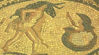 On his way to Erymanthus to capture the porker, Herc stopped by to visit an old friend, Pholus the Centaur, who, like all Centaurs, was man from the torso up and the rest horse. Now, Centaurs in general had a bad reputation, especially after their drunken rampage at the wedding of Pirithous. Remember that vile incident? The Centaurs, devoted followers of my popular cousin Dionysus, had been invited to a wedding feast and had paid too much homage to their patron, abusing the open bar. In a drunken frenzy they had attempted to violate the bride and they managed to molest a number of female guests. A fierce battle ensued, leaving many Centaurs dead. The survivors in disgrace were exiled from Thesally, their home. Hey, that'll teach them to horse around at weddings. |