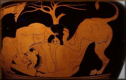 ONE The Nemean Lion was an enormous beast twice the size of a large bear, with huge jaws and razor-sharp teeth. Very ill-tempered. That was the good news. The bad news was, its pelt was impenetrable. Neither iron, nor bronze, nor stone could pierce it. Very similar to hospital food, only not as tough. Some say that the Nemean Lion was the offspring of Typhon, or of the Chimera and the Dog Orthrus; yet others claim that Selene bore it with a fearful shudder and dropped it on earth. You see, as punishment for a promised sacrifice that was not fulfilled, she set it to prey upon the people who dared dishonor her, the story goes. (I can still hear the heated discussions, after hours late night down at Thanasi's Olympus Greek Restaurant: Hesiod: "Hey, I wrote the book, so I should know whodunit. Python was responsible for the Nemean Lion. Vicki, more Ambrosia please." Demodocus: "At Hera's request, Selene created the Lion from sea foam enclosed in a large ark. Iris, the goddess of the rainbow, binding it with her girdle, carried it to the Nemean mountains. Sorry Hes, I normally defer to you, but on this point you stand corrected." Pindar: "It's two against one, Hes: The Nemean mountains were named after a daughter of Zeus and Selene, and the Lion's cave is still a must-visit tourist trap, located about two miles from the city of Nemea. My cousin is a tour guide there, perhaps I can arrange a complimentary visit for you." And so it would go, until Eos, the goddess of the Dawn, would knock on the window and remind us to go home...) At any rate, Hercules arrived at Cleonae, where he lodged at the house of a shepherd named Molorchus, whose son the Lion had killed. Molorchus was about to sacrifice a ram to Hera. Whoa, there! Hold on, pal! Hera, did you say? Heracles would have none of that! He asked Molorchus to wait thirty days. "If I return safely, sacrifice to Savior Zeus; if I do not, sacrifice to me as a hero! Just don't sacrifice to Hera, she makes me mad!" In more ways than one. Herc reached Nemea at midday but found nobody to direct him, since the Lion had de-populated the entire area. Presently he located the Lion as it returned to its lair, covered in blood from the day's slaughter. An expert marksman, Heracles unleashed a torrent of arrows at the beast. The Lion licked its chops bemused, as the arrows rebounded harmlessly off its thick hide. It yawned as Hercules stabbed it with his frightful sword, given to him by Hermes. Incredibly, the weapon bent as if made of soft lead, and worst of all, the warranty had just expired. Herc hated when that happened! Finally Heracles heaved up his club and delivered a stunning blow to the muzzle of the animal that would have done Babe Ruth proud. This had a tiny effect on the beast, for it got up and entered its cave. Herc, casting a rueful glance at his shattered Louisville Slugger, decided to take matters into his own hands. He placed a net at one entrance to the Lion's cave and went in by the other. Knowing that weapons were useless against the Nemean Lion, he began wrestling with it. That's when the Lion bit off one of my nephew's fingers. Bad, bad Lion! Naughty Lion! Now Herc was *issed! The world's strongest man squeezed with all his might until all life left the beast. Hercules 2 - Lions 0, for those of you keeping score at home. Heracles returned to Cleonae with the carcass slung over his shoulder, and found Molorchus about to offer him a heroic sacrifice, it being the thirtieth day. Instead, together they sacrificed to my godfather, Savior Zeus. My nephew then proceeded back to Mycanae, to present the carcass to that sissy, Eurystheus. Even though the Lion was dead, Eury was terrified. After he changed his underwear, he ordered Hercules to immediately remove the nasty Lion and never again to enter the city with scary creatures, dead or alive. In the future he was to display the fruits of his Labors outside the gates. Wimp! Still trying to control his bowels, Eurystheus had his smiths forge him a bronze jar, which he buried beneath the earth. He set his watchmen on the city walls and henceforth, whenever the approach of Herc was signaled, he hid in the urn, and sent his orders by a herald. A hero dies only once, a coward a thousand times - Evidently, one thousand to one odds sounded real good to Eurystheus... At first Herc was at a loss as to how to skin the Lion. All objects shattered next to the thick hide. But my nephew was a clever man - He used the beast's own razor-sharp claws to flay the animal, and in no time was wearing the invulnerable pelt as armour, and the head as a helmet. His exotic fashion statement became all the rage in Greece, and Olympian Dior wasted no time in prominently featuring its Nemean Lion line in its fall fashion show. LABOR