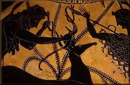 THREE When Artemis, the goddess of the hunt, was still young she saw five hinds, which are female red deer. They were larger than bulls and the sun twinkled on their golden horns. Pursuing them, swift Artemis caught four bare handed and harnessed them to her chariot. Hera had arranged for the fifth one to escape to the Ceryneian Hills, in anticipation of Herc's third Labor. What a dear. Eurystheus next charged Heracles with delivering him the Ceryneian Hind. "After we cut out its golden horns, we'll toss it on the fire and have us a real down-home mutton-fest, Herc!" he chortled. "We'll even invite your rowdy cousin Danny, he always brings you the absolute best wines!" Good luck, he thought to himself. If fleet-footed Artemis can't catch the speedy little devil, you surely aren't about to! I won't be seeing you anytime soon, handsome... good riddance, you muscle-ridden stud! I'm here to tell you that Eurystheus was an oaf. He even blew his one chance at greatness - He was one of the hunters at the storied Calydonian Boar Hunt, and had the initial point-blank shot at the beast. Needless to say, the coward in his fear managed to only graze the still animal, which became enraged and mauled a couple of heroic types, before gorgeous Atalanta and the gang demolished it. Unfortunately, neither of the dead heroic types was named Eurystheus. More on that later...You'll just LOVE my second cousin Atalanta! For one full year Heracles pursued the deer, tirelessly stalking it but taking great pains to capture it alive. He could have brought it down on numerous occasions but that would entail killing it. It's bad enough having Hera on his case, the last thing he wanted was to rouse the wrath of Artemis by hurting her favorite pet. Exhausted at last, the Hind took refuge on Mount Artemisium. Afraid that the deer was going to escape across the river Ladon, dead-eye Herc let loose an arrow (making certain that it wasn't the "dipped in Hydra's blood" type) and pinned the deer's forelegs. The arrow passed between bone and sinew, drawing no blood. Laying the captured animal across his shoulders, Heracles hastened home. That's when he ran into Artemis and her twin brother Apollo, the god of light, and let me tell you, Artemis was not happy. She was ready to take away the Hind and render punishment most severe upon Herc's own behind, when my nephew spoke up. Fervently apologizing to the great goddess, he explained that he was only following the orders of Zeus and her bro Apollo's own Oracle, the Pythoness, who had instructed him to do the bidding of Eurystheus. If anyone should be punished, it should be that punk Eury, who had ordered the capture of her royal Hind. And he planned on eating it! "I think Eury's motives regarding the Hind are somewhat less than palatable, Cynthia!" Herc told her. (She only permitted her closest friends to call her Cynthia! Oh my. My nephew had chutzpah, didn't he?) "And you may want to have Helios keep an eye on him, if Eury ever emerges from his underground jar, Sunshine," he said to Apollo. (Good thing Herc didn't call him Cynthius, Apollo hated that name with a passion! Now, "Sunshine", he thought that was rather original...) Artemis let go of her anger and healed the Hind's wound. One late night down at Thanasi's Olympus Apollo told me that in all honesty his sister was amazed that my nephew had managed to capture relatively unharmed the trophy which had eluded even herself. "Let's just say sis was impressed, Myth Man dude," he grinned. "Besides, I wouldn't have let her harm Herc. Nobody had called me Sunshine before! Also, one of these days all us gods are going to have to call on your nephew to save us from the Giants. You don't think I just happened to be there by accident, do you?" I kept forgetting that Apollo knew everything, even the future. Neat skill, came in useful on more than one occasion, but it was rather disconcerting at times. To fulfill the directive of Pythia the Pythoness, Artemis permitted Heracles to carry the deer alive to Mycanae, but warned that if Eurystheus even thought of turning her pet into dinner, she would personally seal him tight inside his jar, or words to that effect. "Tell the creep that if he touches a hair on my Hind, I will roast his behind!" she told Hercules as they parted. Oh dear. Needless to say, coward Eury treated the Hind like one of his own children. What a revolting turn of events for him. How he wished that he had never dreamed up this particular labor. Ah, hindsight...Too late, Eury, you have a tough roe to hoe... |