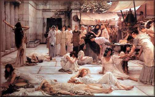 (Many, many years later my cousins threw another such Thespian party in a faraway land, and called it Woodstock. Needless to say, they didn't neglect to send me a couple of back-stage passes...I love those girls! Did I tell you about the time I got to ride on Pegasus, the winged steed of the Muses? Oh my, Pegasus got so excited that he reared and kicked the side of Mount Helicon, causing a couple of springs to gush forth. The Thespians worshipped these waters, as well they should, for they provided poetic and artistic inspiration. More on that later, it's a great story!) THE DAUGHTERS OF KING THESPIUS King Thespius and his wife Megamede, daughter of Arneus, were concerned that their fifty beautiful daughters would find unsuitable mates, so they decided that every one of them should have a child by Hercules, who was now busy hunting down the Cithaeron Lion. "You may have my eldest daughter Procris as your bed-fellow," Thespius told Hercules, the true epitome of Greek hospitality. Nudge, nudge, wink, wink. For fifty straight days Herc lodged at Thespiae and each night another of Thespius' daughters visited him, until he had enjoyed every one. Lucky stiff! I asked him how he was holding out near the end and my nephew confided in me that long ago he had located the lion, and could have killed it then, but "King Thespius sure has some fine looking daughters, one more comely than the other, and I'd sure hate to disappoint him by leaving any 'loose ends', so to speak." Wasn't Herc thoughtful? Oh my, the sacrifices a Greek demi-god must make. It brings tears to my eyes, just thinking about it. When I mentioned to him years later that one late night down at Thanasi's Olympus grandpa Hesiod suggested that Hercules laid with all fifty daughters in one night, my nephew blushed and grinned mischievously. Turns out that once he was finished pleasuring daughter number one, and she crawled back to tell her sisters, they couldn't wait their turn and "swarmed" him, so to speak. "What could I do, unc?" he winked at me. "I got a reputation to uphold, after all, strongest and most virile man in Greece, and all that..." Oh my. So that's what they mean by "Herculean task"...That's Zeus's boy for you. |