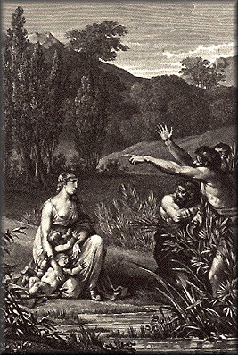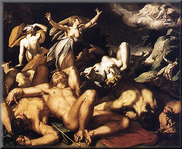 "Don't spit in the soup, we've all got to eat," is advice the Lycians never learned. Seeing them so tight-fisted and mean, and at the same time so in love with the pool, Leto turned them into frogs so that they could live in its depth, forever enjoying the water and the mud. Among the first things the twin gods Apollo and Artemis did as soon as they were born was to punish all the men of that time who, when Leto was pregnant and in the course of her wanderings, refused to receive her when she came to their land. Paybacks are a bitch! Only four days after his birth Apollo went to Mount Parnassus and killed the dragon Python, thus avenging his mother, though others say the dragon was at Delphi keeping the oracles of Themis. Four days old? Those ancient Greeks sure developed fast! Leto was once attacked by the giant Tityus, son of Gaea (Mother Earth), or son of Zeus & Elare. I suspect that Hera sent him against Leto and he attempted to rape the goddess. But the twins Artemis and Apollo killed him, or perhaps the thunderbolt of Zeus, and he is still being punished in the Underworld for having tried to violate Leto. There, a couple of vultures, or as some say a serpent, eat his liver, which grows with the moon, for ever. Ever-thoughtful Prometheus once sent Titius a "Been there - Done that, got the scars to prove it!" postcard. Leto was also insulted by Queen Niobe, wife of King Amphion, who boasted that she was more blessed with children than Leto and besides that, they were more beautiful. Bad, bad move. You see, Niobe got so full of herself, and with the prosperity of the kingdom, that she began to wonder how people could be so stupid to worship the power and wealth of the gods, which is of an invisible kind, instead of being devoted to the tangible things they had in front of their eyes. She thought it convenient to introduce reforms in the religious rites and ordinances, so that their subjects could attain a more down to earth form of understanding. In other words, why worship mere Leto, when you can worship glorious Niobe, fools! Coming to the temple of Leto, she addressed the worshippers: "What madness this, to prefer gods whom you have only heard of to those whom you have seen?" And after displaying her own family tree she explained to the people that in her palace there were great stores of wealth, that her own beauty was worthy of a goddess, and that whatever story had been told about Leto, it could not be compared with the splendor of her own biography. For, among other things, while she Niobe had many children, Leto had but two, and somewhat suspect too, because Artemis was girt in a man's attire and Apollo wore long hair and used a woman's robe. She didn't come right out and say it, but the insinuation was there that she considered Artemis a lesbian and Apollo gay. Ladies and gentlemen, please meet Niobe, history's first recorded homophobe. And to remind the people that her words were backed by power, Niobe ordered the worshippers to take off the laurel wreaths from their hair and leave the temple. So those who prayed, fearing religious intolerance, left the temple without a word, but as it often happens, with unchanged mind. Apollo and Artemis swiftly made it their mission to avenge their insulted mother. "Let's go show the good lady the type of mayhem a couple of queers can perpetrate, sis!" said Apollo. And coming down from heaven they shot their arrows from afar against the children of Niobe, who one after the other fell dead.
