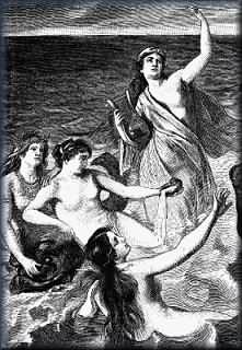 VARIOUS WRITERS' TAKE ON THE SIRENS Homer does not name the Sirens individually nor mention their parentage, but by using the dual in reference to them he indicates that they were two in number. Sophocles, in his play Ulysses, called the Sirens daughters of Phorcus, and agreed with Homer in recognizing only two of them. Apollonius Rhodius says that the Muse Terpsichore bore the Sirens to Achelous. Hyginus names four of them, Teles, Raidne, Molpe, and Thelxiope, and, in agreement with Apollodorus, says that they were the offspring of Achelous by the Muse Melpomene. Tzetzes calls them Parthenope, Leucosia, and Ligia, but adds that other people named them Pisinoe, Aglaope, and Thelxiepia, and that they were the children of Achelous and Terpsichore. With regard to the parts which they took in the bewitching concert, he agrees with Apollodorus. According to a Scholiast on Ap. Rhod., Argon.iv.892, their names were Thelxiope, or Thelxione, Molpe, and Aglaophonus. As to their names and parents see also Eustathius on Hom. Od. 12. p. 1709, Scholiast on Hom. Od. xii.39, who mention the view that the father of the Sirens was Achelous, and that their mother was either the Muse Terpsichore, or Sterope, daughter of Porthaon. Similarly Apollonius Rhodius describes the Sirens as partly virgins and partly birds. Aelian tells us that poets and painters represented them as winged maidens with the feet of birds. Ovid says that the Sirens had the feet and feathers of birds, but the faces of virgins; and he asks why these daughters of Achelous, as he calls them, had this hybrid form. Perhaps, he thinks, it was because they had been playing with Persephone when gloomy Dis carried her off, and they had begged the gods to grant them wings, that they might search for their lost playmate over seas as well as land. In like manner Hyginus describes the Sirens as women above and fowls below, but he says that their wings and feathers were a punishment inflicted on them by Demeter for not rescuing Persephone from the clutches of Pluto. Another story was that they were maidens whom Aphrodite turned into birds because they chose to remain unmarried. It is said that they once vied with the Muses in singing, and that the Muses, being victorious, plucked off the Siren's feathers and made crowns out of them for themselves. In ancient art, as in literature, the Sirens are commonly represented as women above and birds below. Homer says nothing as to the semi-bird shape of the Sirens, thus leaving us to infer that they were purely human. This is not mentioned by Homer, but is affirmed by Hyginus. Others said that the Sirens cast themselves into the sea and were drowned from sheer vexation at the escape of Ulysses.